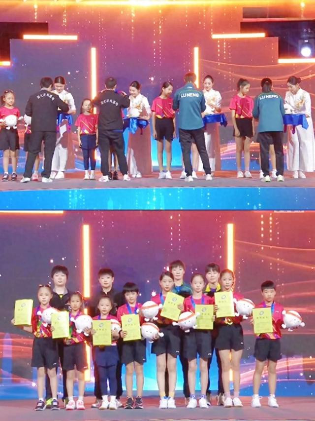 受奖礼的第一个身手是,由乒超联赛冠亚军的四位代表王曼昱、陈幸同、孙颖莎和蒯曼,为国少接受赛女子7、8、9、10岁的优越者受奖。在这个身手,四大国手皆很温柔可亲,她们在小妹妹们身上彰着看见了往日的我方,也看到了国乒后继有东说念主的但愿。在合影身手,陈幸同不得不暗暗踮起脚,看来国乒的将来小花们,躯壳要求皆很出色。