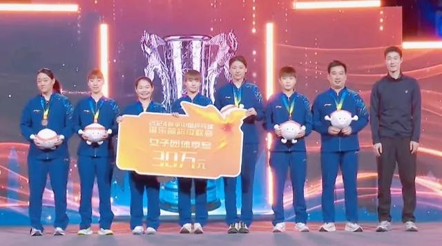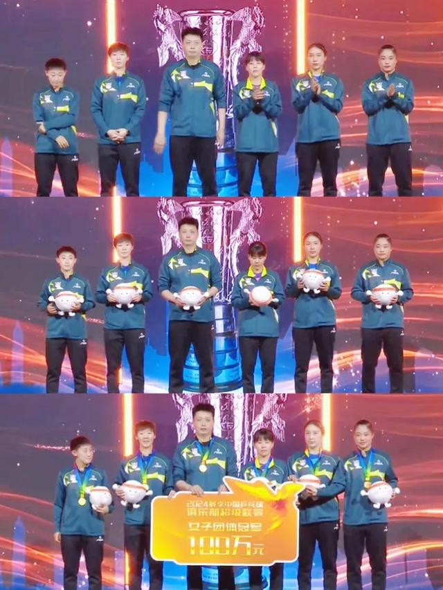 接下来,乒超联赛女团季军上海龙腾队上台领奖。季部队成员包括:孙铭阳、何卓佳、刘炜珊、杨屹韵、马小惠。她们同期成绩了30万元东说念主民币季军奖金。