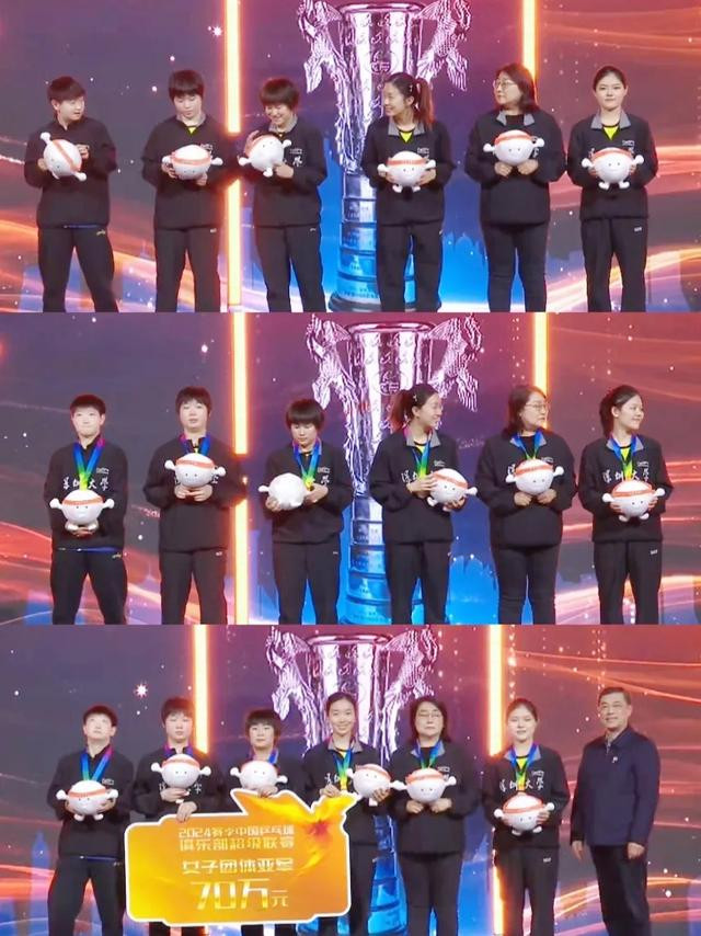 随后,亚军深圳大学俱乐部登台领奖。深圳大学队成员包括:孙颖莎、蒯曼、覃予萱、吴咏琳(中国香港)。这支球队中,24岁的孙颖莎是年纪最大的长姐,其余选手皆是20岁新东说念主类,因此也被称为“深大幼儿园”。孙颖莎本场决赛空砍2分,缺憾错失卫冕,原来不太发放的她,在领到毛绒牵挂玩偶后,坐窝容或起来,她一直在束缚的摆弄着玩偶,还东观西望的呼唤队友扫数讨论,实锤“幼儿园”无疑。亚军球队得回了70万元东说念主民币的奖金。